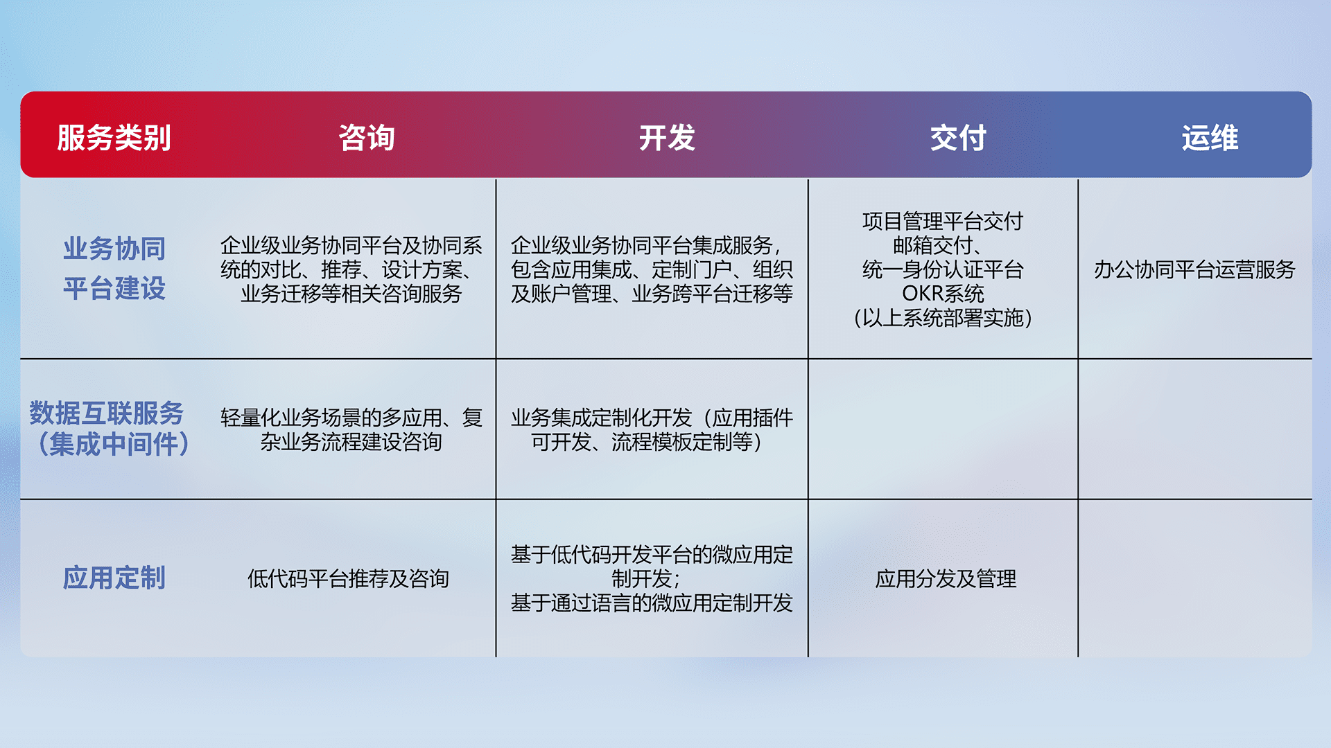 针对钉钉、、、、企微、、、、IDaas等平台级产品提供产品的规划、、、方案、、、、交付、、、、定制化开发等服务,,,,实现如统一协同办公、、、智能客户服务、、、混合会议管理、、、、智能数据查询、、等业务场景,,,实现数字化转型。。。
